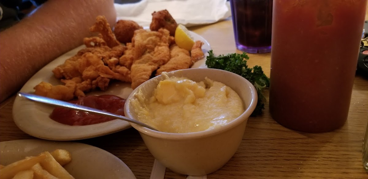 We got the fried flounder and cheese grits. Our dinners werr cooked perfectly and tasted great! Generous portions of flounder but the corn nuggets appetizer is a little pricey for the quantity. Staff was very friendly, dinner came out quick and hot.